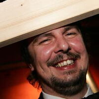 Martin Zumtobel mit Strohhut, Haaren aus Stroh und Dreitagebart. -