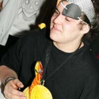 Ein Mann mit Stirnband und einer Augenklappe. Im Hintergrund sieht man ein T-Shirt mit Totenkopf. -