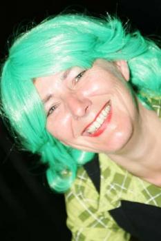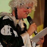 Barbara Guth liest beim Krüppelballkabarett die Stimme aus dem Hintergrund. Sie ist als Clown verkleidet. -