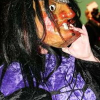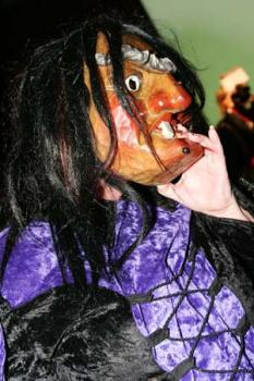 Eine Hexenmaske mit einem violett, schwarzen Kostüm. -