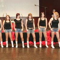 Bei ihrem Auftritt. Sie knien in Zweierreihe auf dem Boden. Im Hintergrund sieht man Prinzessin Multiplex Congenita und Renui Lahmer auf der Bühne. -