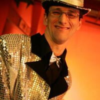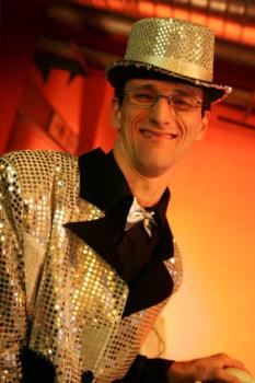 Spasmo mit einem glitzer Kostüm und einem glitzer Zylinder. -