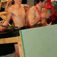 Ein Unglaublicher steht breitbeinig da. Ein anderer hängt kopfüber zwischen seinen Beinen. Dieser stützt sich mit den Füßen am Rücken des anderen ab, während dessen trommelt der Stehende auf sein Hinterteil - Po trommeln. -