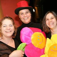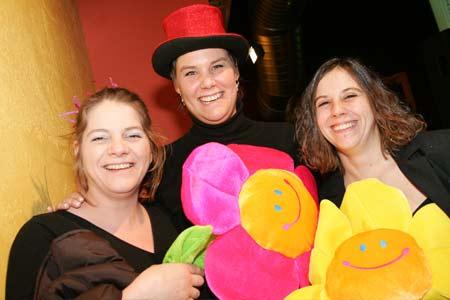Drei Frauen mit großen bunten Stoffblumen in der Hand. Die Frau in der Mitte trägt ein roter Zylinder. -