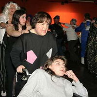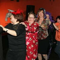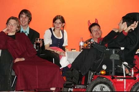 Zwei Rollstuhlfahrer sind umzingelt von drei Frauen. Die Linke Frau ist als Vampir verkleidet und steht mit dem Fuß auf Klaus seinem Bein. Klaus der zwei rote Teufelshörner auf dem Kopf hat schreit. In der Mitte schaut eine Clownfrau nach vor mit roten Ba -