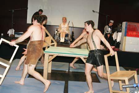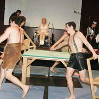 Zwei springen in gegengesetzter Richtung über einen Tisch. Im Hintergrund sieht man Multiplex Congenita auf der Bühne. -