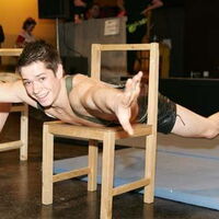Ein Unglaublicher liegt mit dem Bauch auf einem Stuhl und streckt Hände und Beine von sich. -