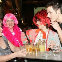 Leute stehen an der Bar und unterhalten sich. Eine hat eine rosarote Perücke an und eine Federboa um den Hals. -