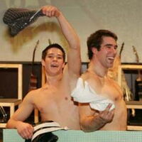 Zwei unterhalten sich. Der eine hat ein roter Kuss auf der Wange. -