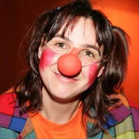 Mit roter Nase, Pippifrisur und roten Backen. -
