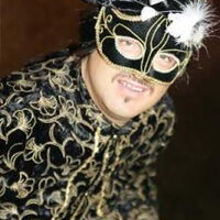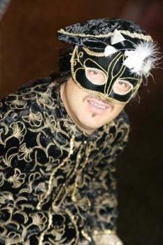 Moderator Renui Lahmer mit schwarzem, goldbesticktem Gewand, venezianischer Augenmaske und Federhut. -