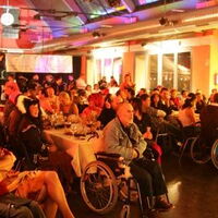 Gäste mit und ohne Behinderung vor einer Wand. -