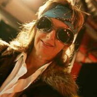 Cornelia Pfanner mit einer großen Sonnenbrille und einem blauen Stirnband. -