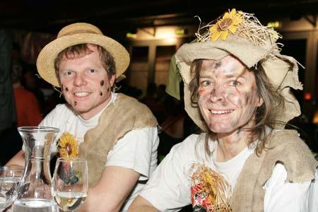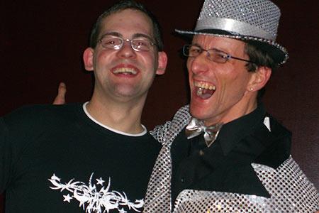 Dr. Peter Ammann verkleidet als Frau und DSA Bernhard Amann mit Kurzhaarperücke als Paar beim Mitternachtsdinnerauftritt. -
