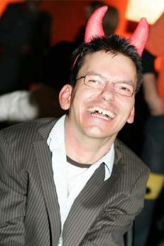 Ein Paar: Sie als Engel verkleidet mit weißen Flügen und Heiligenschein. Er ganz in rot als Teufel verkleidet mit langen roten Haaren und schwarzen Hörnern. -