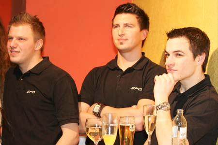 Drei Männer an einem Tisch auf dem Bier- und Sektgläser stehen. -