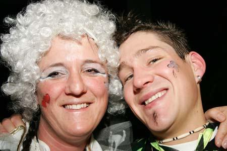 Ein Pärchen. Sie als Zauberin verkleidet, er trägt eine Latzhose und ein rotgestreiftes T-Shirt. -