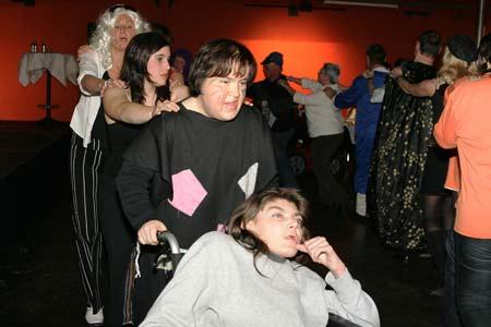 Wir fassen uns von hinten an die Schulter ! Unsere Krüppelballgäste beim Polonäsetanz. -
