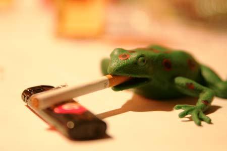 Ein Plastikfrosch mit einer Zigarette im Maul, die auf einem Feuerzeug liegt. -