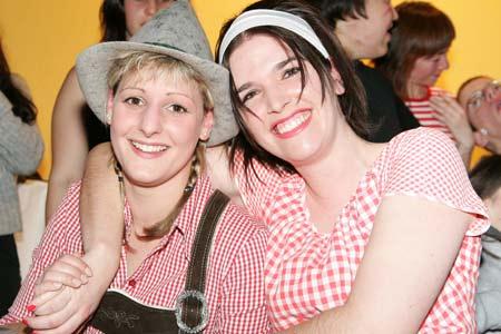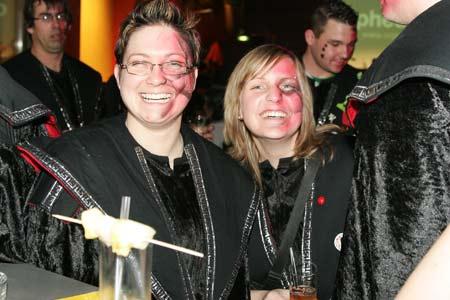 Zwei Frauen von den Kehlegger Schalmeien stehen an der Krüppelballbar und lachen. Sie tragen schwarz-rot, glitzernde Kostüme und haben das Gesicht halbseitig bemalt. Im Vordergrund sieht man eine Krüppelballbowle. -
