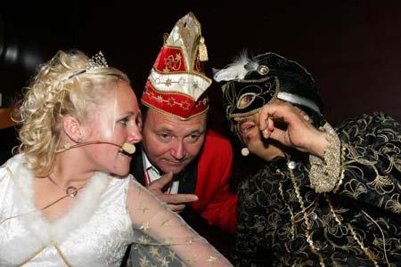 Prinzessin Multiplex und Renui Lahmer besprechen mit dem Leiter der Langenegger Garde, der eine rot weiße Karnevalsmütze trägt, den Ablauf. -