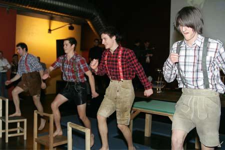 Vier junge Männer in Lederhosen. Sie springen auf Stühle. -