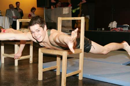 Ein Tisch auf dem zwei Stühle stehen. Auf den Stühlen sitzen jeweils ein Unglaublicher. In der Mitte sieht man einen Unglaublichen, der auf einer Stuhllehne einen Handstand drückt. Im Vordergrund zeigt der Vierte einer Figur, die im Turnjargon Schwalbe ge -