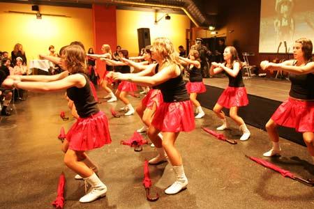 Die Langenegger Garde bei ihrem zweiten Auftritt. Sie tragen schwarze Tops und rote Minniröcke. Sie stehen in der Hocke und halten rote Regenschirme zwischen den Beinen. -