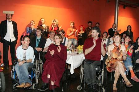 Das Vorarlberger Krüppelballkabarett bei seinem Auftritt. Von rechts nach links: Claudia Fessler, Reinhard Zischg, Andreas Guth, Sabrina Nitz, Eberhard Zumtobel. -