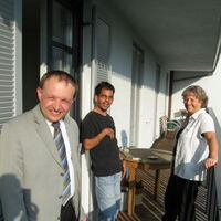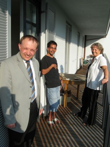 Auf dem sonnigen Balkon erholen sich Martin Müller und Marco Walch von Mensch Zuerst-People First Vorarlberg mit Isabella Tschemernjak von Selbsthilfe Vorarlberg. -