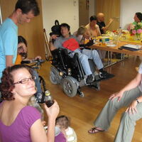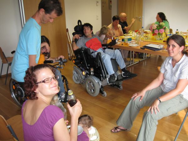 Mehrere Menschen sitzen um einen großen Tisch. Im Vordergrund zwei Rollstuhlfahrer und eine Rollstuhlfahrerin. Ganz rechts die Reiz-Kassierin Angela Kreil mit ihrem Baby auf dem Schoß. Alle schauen zum Betrachter und lachen. -