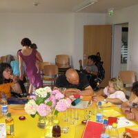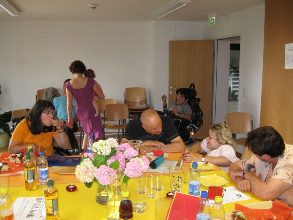 Mehrere Menschen sitzen um einen großen Tisch. Links vorne sieht man das Profil eines Rollstuhlfahrers. Auf dem Tisch stehen Getränke und ein großer Blumenstrauß. -