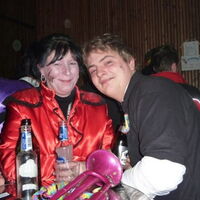Zwei Ladys, verkleidet als die legendäre Rockgruppe "Kiss". Sie stehen mit weit aufgerissenem Mund vor der Kamera. Sie sind sehr fröhlich. -