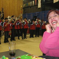 Julia hält lachend mit den Finger die Ohren zu. Hinter ihr spielt lautstark die Guggamusik auf.