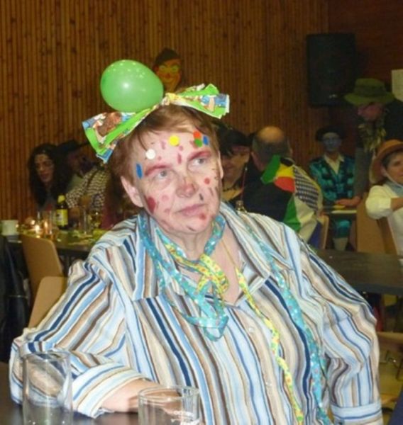 Martha, die Clownfrau, schaut etwas skeptisch in die Kamera. Im Hintergrund sieht man zahlreiche Partygäste. -
