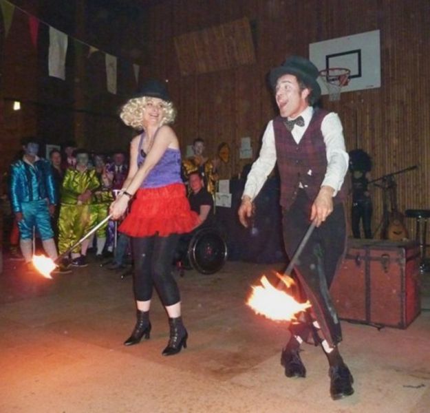 Pompo in seinem Element, dem Spiel mit dem Feuer. Neben ihm eine junge Frau mit blonder Perücke, die ihm assistiert. -