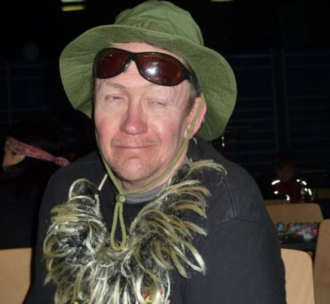 Werner, in einem weißen T-Shirt mit dem Aufdruck "Ich bin ein Star" und schwarzer Perücke, sitzt an einem Tisch. Vor ihm ein paar leere Bierflaschen. -