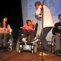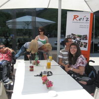 Die ReizlerInnen leiten die Info-Veranstaltung, die am Nachmittag stattfindet. Sie sitzen vor dem Cafe "Bühne 3". -