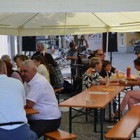 Während die Band an ihren Instrumenten steht und die Musik klingen lässt, sitzen die Gäste bequem auf den Biertischen. Vertieft in Gespräche, Essen und Getränke. -