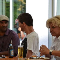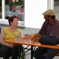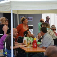 Festgäste an den Tischen. Entspannte Blicke. Lachende Gesichter. Interessierte Gespräche. Tische gefüllt mit Tassen, Flaschen, Gläser. Im Hintergrund die Band am Singen. -