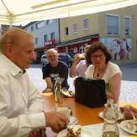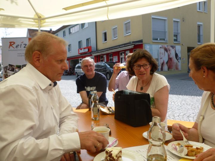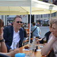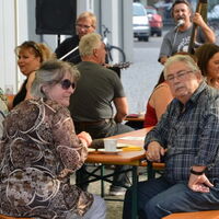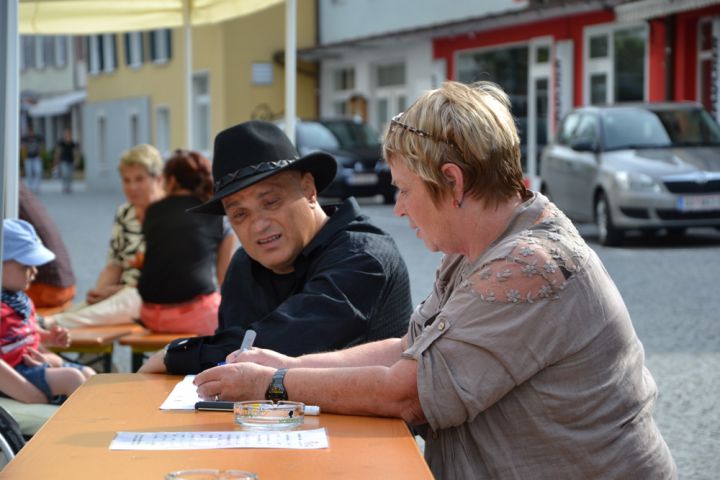 Obmann Andreas Guth bei der Eröffnungsrede. Reinhard Zischg übersetzt. Marianne Schulze lacht fröhlich. Auf dem Kopfsteinpflaster reflektiert die Sonne. -