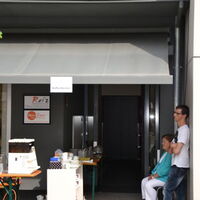 Obmann Andreas Guth lehnt an der Eingangswand zum Reiz-Gebäude. Er beobachtet das Reizfestgelände. Neben ihm sitzt eine Frau und späht in die gleiche Richtung. Kaffee und Kuchen stehen bereit zum Verzehr. -