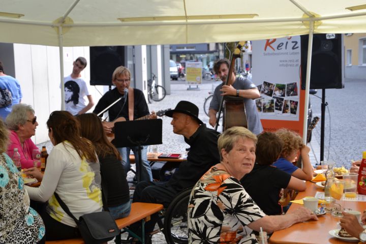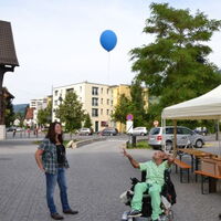 Auf dem Kopfsteinpflaster im Vordergrund dreht Sülo mit seinem Rollstuhl ein paar Tanzrunden zur Musik. Die zwei mit Luftballons geschmückten Sonnendächer mit den Festgästen im Hintergrund. -