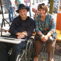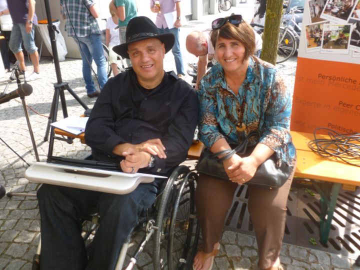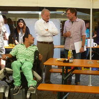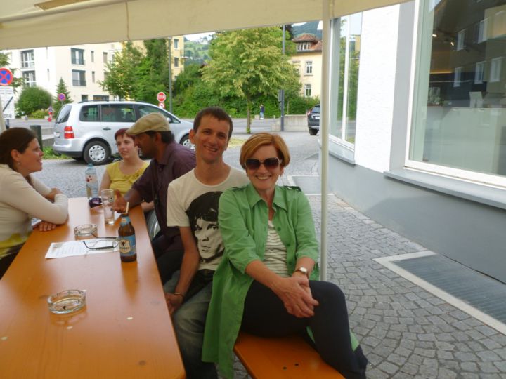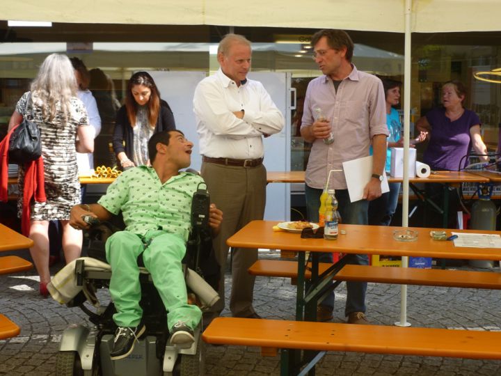 Marianne Schulze verfolgt lachend und mit verschränkten Händen die Ausführungen von Reinhard Zischg. Reinhard ganz in Schwarz, lässig im Rollstuhl nach hinten gekippt. Heinz Grabher im Hintergrund mit verschlossenen Lippfen. -