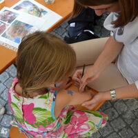 Mit geübten Händen malt eine Frau bunte Blumen auf den Arm eines Mädchens. Das Mädchen folgt mit den Augen dem Farbstift. -