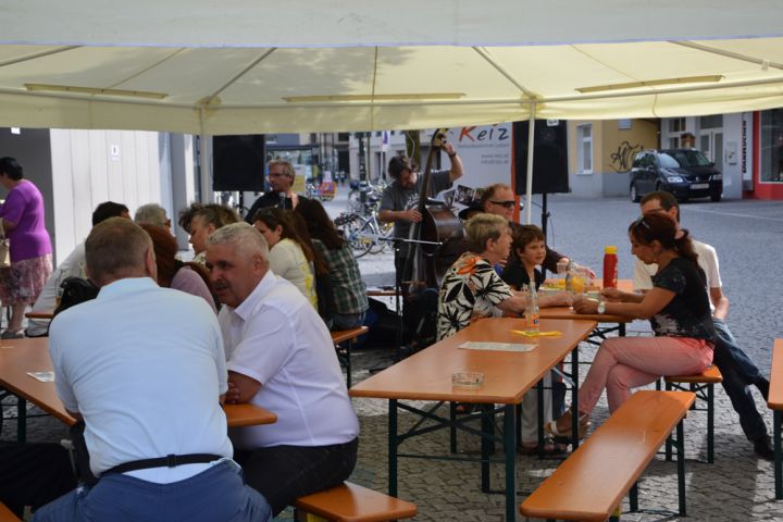 Die Band T.C.Unplugged spielt für die Gäste auf. Ein Mann mit Gitarre singt ins Mikrofon. Ein Mann mit Kontrabass swingt zum Rhythmus. -