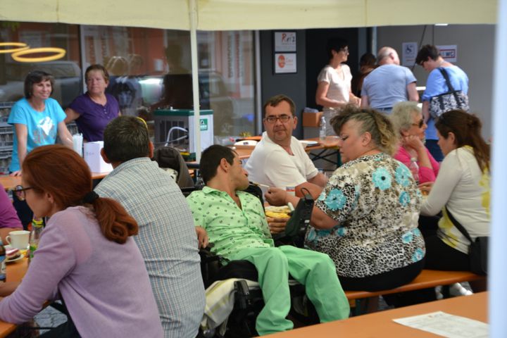 Mitten unter den Festgästen an den Tischen. Eine Frau gibt einem Rollstuhlfahrer Feuer für die Zigarette. -