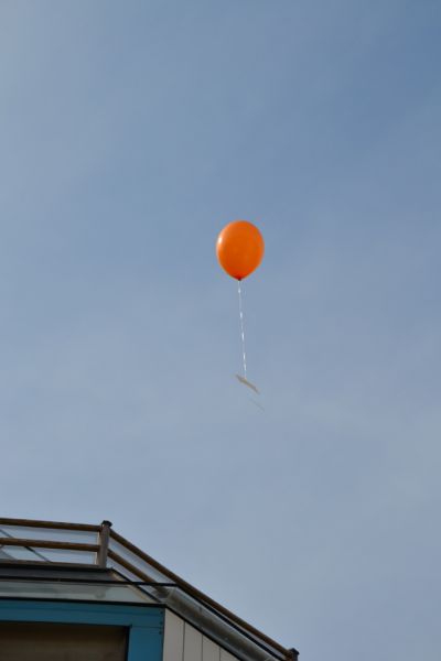 Ein orangefarbener Luftballon mit einer Nachricht am Bändel steigt in den Himmel. -