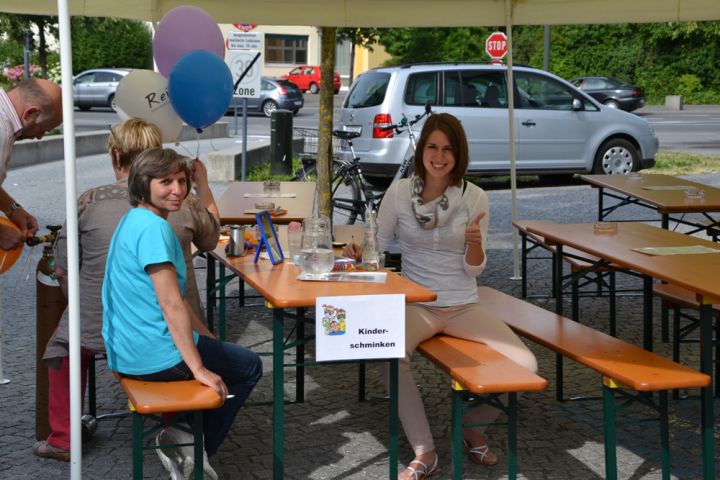 Eine junge Frau ist bereit zum Kinderschminken. Sie deutet mit ihrem Daumen: OK. Die Nachbarin schaut freundlich lächelnd in die Kamera. Im Hintergrund werden Luftballons mit Gas gefüllt. -