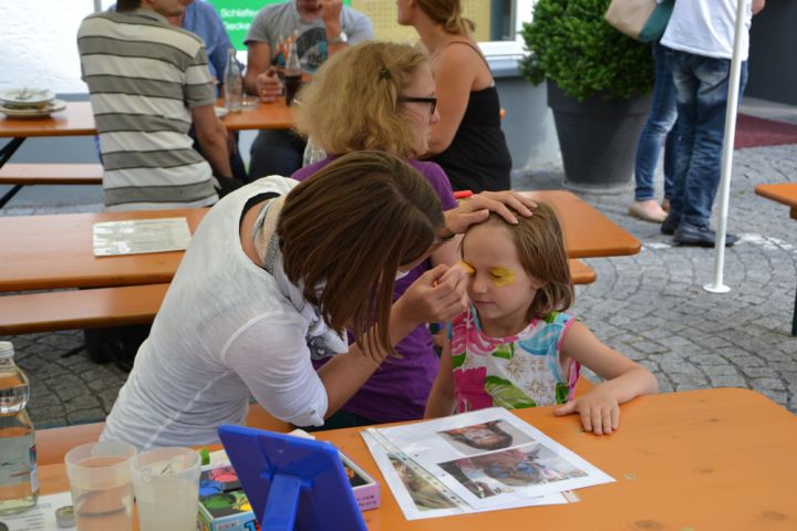 Ein Mädchen sitzt mit geschlossenen Augen beim Kinderschminken. Ihre Augenlider werden gelb bemalt. -